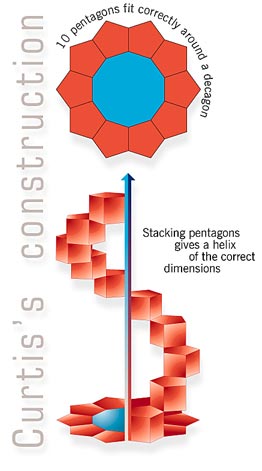 DNA has ten base pairs to each turn of the helix, so, using these centuries-old methods, Curtis began with a decagon-a 10-sided figure. He then placed a pentagon for each base around it (see Diagram). The pentagon is the only regular shape that can fit round a decagon in this way without leaving any space. And according to Curtis, this figure of 10 pentagons oriented about a decagon is the only geometrical configuration that enables one to create a helix with the known dimensions of DNA. Add some thickness to each of the pentagons, and the 10 pentagons telescope out to form a helix. To build a structurally sound double helix, Curtis reasoned that he would need not just one pentagon, but two joined together . With this insight he was finally able to produce the drawings and paintings that he had originally planned.