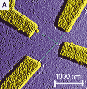 You’re looking at the world’s smallest transistor (where the blue lines cross, just a few atoms thick). The lines are carbon nanotubes, cylindrical molecules of strongly bonded carbon, which have a strength more than five times that of steel and almost no electrical resistance. The transistor was built by physics professor Alex Zettl, who has also used nested carbon nanotubes as tiny bearings that are wear-free and almost completely frictionless, and which could be used to lubricate the tiny gears used in some micro-electro-mechanical systems (MEMS). Zettl says that in the future they might even be used for NEMS—nano-electro-mechanical systems—which would be around the size of molecules, a thousand times smaller than the already tiny MEMS devices. Zettl is one of nearly 100 scientists at Berkeley involved in nanotechnology-related research. The field got a huge boost at the beginning of last year, when President Clinton announced his National Nanotechnology Initiative, allocating hundreds of millions of dollars of federal funds to research in the area. The initiative was in part the idea of Tom Kalil, then a science advisor to President Clinton, and now science advisor to Chancellor Berdahl. “We’ve been on this Moore’s Law curve of being able to double the capacity to store and process information every 18 months. But the technology we’ve been using to do that may run out of gas at some point,” says Kalil, who predicts that electronic circuits made of carbon nanotubes will move in to revolutionize computing, one day making it possible to store the entire Library of Congress in a device the size of a sugar cube.